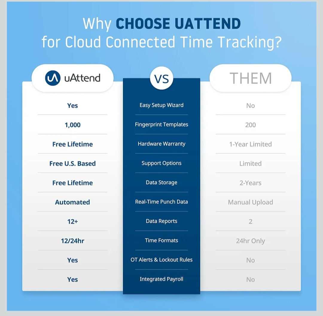 Advanced Time Tracking: The uAttend JR2000 makes employee time tracking effortless and accurate, powered by a cloud-based system designed for business efficiency.